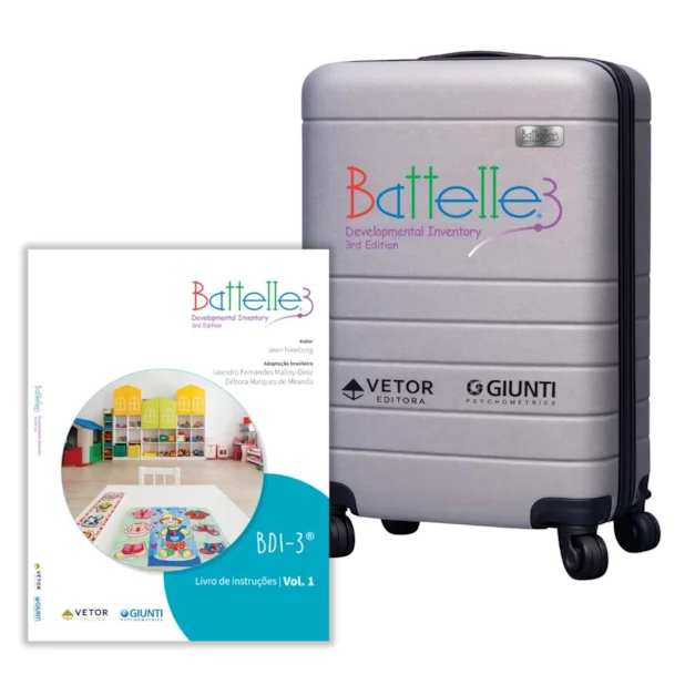 Coleção completa do Inventário de Desenvolvimento Battelle, 3ºedição (BDI-3), contemplando o conjunto integral de materiais necessários para a avaliação, conforme detalhado em Composição. O instrumento é disponibilizado com seus volumes de instrução e aplicação, cartões, cadernos e formulários, além do kit de manipuláveis, organizados para uso profissional e rotina de atendimento. Para favorecer a conservação, a organização e o transporte do material, o conjunto é enviado em mala de rodinha, possibilitando maior praticidade no deslocamento entre contextos de aplicação e ambientes institucionais.